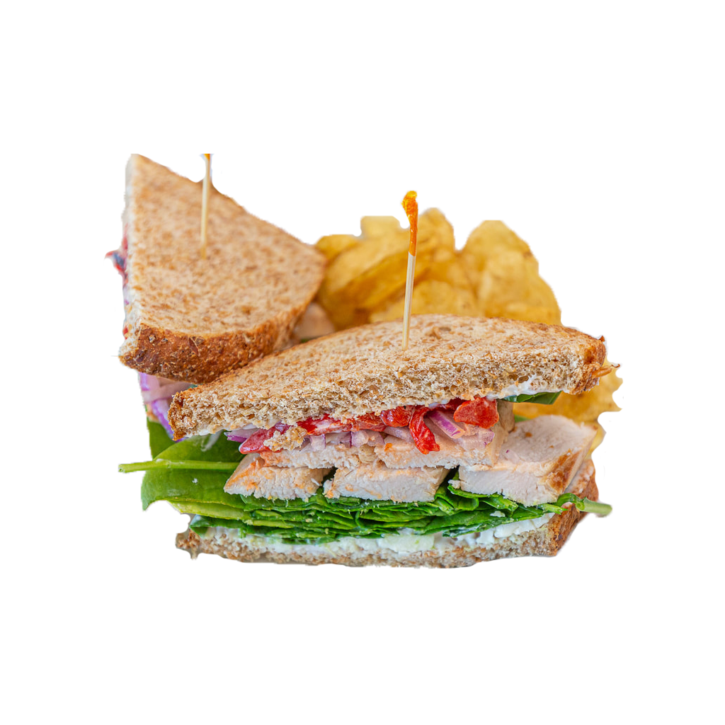 Chicken, Feta, Onion, Spinach, Roasted Red Peppers on Sprouted Whole Wheat